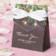 Caixas de lembranças de Natal personalizadas com fundo de madeira escura, galhos de árvore de Natal festivos, enfeites de árvore vermelhos e dourados, pinhas, luzes cintilantes, o título 'obrigado' e seus nomes.