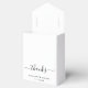 Caixa de favores brancos de casamento com "Love + Obrigados" em uma simples tipografia moderna e um roteiro elegante com sucos, seus primeiros nomes unidos por um coração e sua data de casamento.