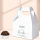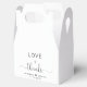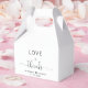 Caixa elegante de favoritos de casamento com "obrigado + amor" em uma simples tipografia moderna e um roteiro de na moda, seus primeiros nomes unidos por um coração e sua data de casamento.