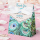 Uma bela caixa de favores de festa de casamento moderna com seu texto totalmente personalizado e um adorável ornamento de penas de pavão com cores vibrantes. Um design original disponível exclusivamente na loja online ©GardenEden.