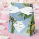 Esta design apresenta palmeiras tropicais em uma praia. O belo verde das palmas contrasta com o céu azul e a água. O losango branco opaco leva à frente a tipografia moderna. Uma fusão perfeita de modernos e quicos. Design verde-palmeira ideal para um casamento de praia tropical. O favor de casamento de praia design com elementos modernos. Os convites de casamento e outros artigos de papelaria também estão disponíveis.
