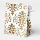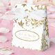 Um belo damasco de ouro em uma caixa de favor branca de fundo. Adicione seu nome no script e a data. Pura elegância! Ênfase de fita de cetim maravilhosa.