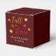 Presentes personalizados para eventos 'Fall in love' com paleta de cores de outono em vermelho, laranja e amarelo com folhas de bordo. O texto pode ser personalizado para um casamento, chá de noiva, chá de bebê ou qualquer outro evento