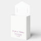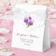 Estas caixas de favoritos de casamento apresentam flores de lírio púrpura com cor d'água com nomes de noiva e noiva, obrigado mensagem e data de casamento. Eles fazem parte de uma coleção que inclui uma gama de cheios de artigos de papelaria de casamento e de noivas. Visite nossa loja ou veja nossas páginas de coleta para ver a faixa de cheios de produtos correspondentes que você pode personalizar para o seu casamento.