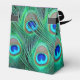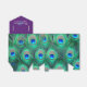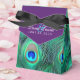 Caixas de lembrancinhas de casamento elegantes com penas de pavão roxo ameixa e esmeralda verde vibrante, azul real e azul turquesa. Você pode alterar a cor do laço, adicionar texto no estilo de fonte, tamanho e cor de sua escolha nesta linda caixa de lembrancinhas de casamento de pavão roxo ameixa.