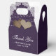 Coloque seus presentes de chá de panela/casamento nessas caixas de favores românticas roxas roxas com rendas florais brancas e luzes de cordas em um fundo de burlap.
