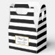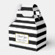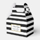Esta caixa de favor distribuída é preto e branco. Personalize a caixa de favoritos com o texto desejado, como Obrigado, os nomes da noiva e do noivo e/ou a data do casamento.