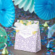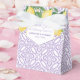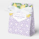Caixas de lembrancinhas de chá de bebê de limão cítrico atemporal, com um padrão de fundo roxo e branco, baseado em uma impressão de azulejo vintage.