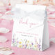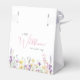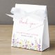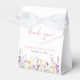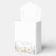 Caixas de lembrancinhas para o chá de bebê da sua menina com "obrigado" e "uma pequena flor silvestre está a caminho" exibidos em tipografia cinza claro e uma caligrafia rosa estilosa e aquarelas inspiradas em boho de flores silvestres roxas, rosas e amarelas. Personalize o nome da mãe e a data do chá em letras simples rosa e cinza.