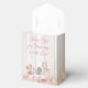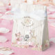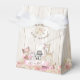 Caixas de lembrança para chá de bebê com adoráveis animais da floresta em um fundo floral e rústico de madeira. Essas caixas de lembrança para chá de bebê de menina são facilmente personalizadas com seu texto.