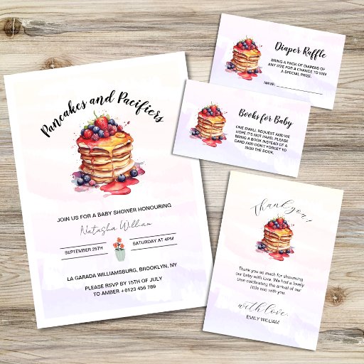 Este design apresenta o tema do chá de fraldas "Panquecas e Pacificadores" empilhado de panquecas com morangos, mirtilos e xarope de bordo. Perfeito para um brunch de bebê. Este produto pode ser facilmente personalizado. Se precisar de ajuda para a personalização do produto ou se precisar de produtos correspondentes, por favor contacte-me através do Zazzle.
