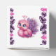 Um pássaro vibrante e caprichoso com penas roxas e rosadas fofinhas. Possui grandes olhos expressivos adornada com joias brilhantes em tons de rosa e turquesa. A cabeça do pássaro é decorada com uma estrutura semelhante à coroa feita de flores rosa. As penas da cauda são um tom surpreendente de cor-de-rosa com padrões roxos. O pássaro fica ereto, com os pés posicionados no chão, e suas asas ligeiramente inclinadas para cima.