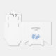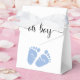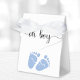 Uma caixa de favoritos para o seu chá de bebê apresentando "oh boy" em um roteiro de na moda com pestanas e uma aquarela azul de pés de bebê. Sob o flape você pode facilmente personalizar com o nome da futura mãe e a data do chá.