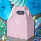Esta bonitinha caixa de favoritos de chá de fraldas rosa apresenta um adorável cavalo de balanço sobre sua elegante tipografia branca minimalista e abaixo de um belo arco. Caixas de favor simples e doces para uma mãe esperando uma menina.