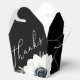 Personalize caixas de lembrancinhas de chá de noiva com um grande Obrigada na frente, os detalhes do seu chá de noiva no verso e elegantes flores e folhas de anemona pretas e brancas em um fundo preto. Itens CORRESPONDENTES em nossa coleção. TODOS OS ESTILOS DE CAIXAS DE LEMBRANCINHAS feitos para você em nossa coleção.