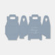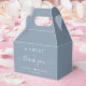 Caixa de favores azuis e poeirentos com "um doce obrigado para você" em uma simples tipografia e um elegante roteiro branco com sucos, seus primeiros nomes se juntaram por um coração e sua data de casamento.