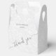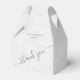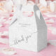 Padrão de impressão filigrana branco elegante com seus nomes e agradecimento em letras charmosas em cinza carvão (ou qualquer cor) na frente, essas caixas de favores para festas em estilo gable são lindas para favores de casamento, favores de chá de noiva ou qualquer ocasião especial.