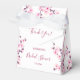 Esta caixa de lembrancinhas para chuva de noiva com flor de cerejeira apresenta lindas flores de cerejeira cor-de-rosa num fundo branco. Caixa botânica com um texto de agradecimento, texto de chuva de noiva e o nome da noiva personalizado num elegante tipo de letra caligráfico.