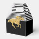 Caixas de favores de beiral com tema de Derby para chuva de presentes de noivado apresentam um cavalo de corrida em brilho dourado falso em listras pretas e brancas na parte superior e preto na parte inferior com sua mensagem pessoal. Itens CORRESPONDENTES em nossa coleção.