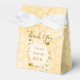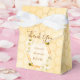 Uma caixa de favores para um chá de panelas de verão. Fundo amarelo, branco com um padrão de favo de mel. Com uma moldura geométrica em dourado falso. Decorado com flores tropicais amarelo claro, creme, hibiscos e abelhas felizes. Com o texto: Obrigado e Noiva Abelha escrito com um estilo de letra manuscrita moderna. Modelo para o nome da noiva e a data do chá. Letras marrons.