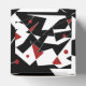 Várias formas geométricas brancas e vermelhas estão espalhadas sobre um fundo preto, criando um forte contraste. Algumas formas são interconectadas com linhas brancas finas, e pontos vermelhos adicionam um pop de cor à composição.