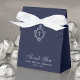 Uma elegante caixa de lembrancinha de comunhão solene de menino azul marinho e prata. Na aba, tem uma crista vintage com uma cruz no centro, ambas em folha de prata falsa.