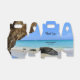 Uma pequena caixa de favores com uma fotografia cênica. Belo mar azul de turquesa com uma praia arenosa. Uma rocha marrom grande fornece sombra do céu azul brilhante.