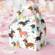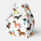 Cães de dachshund de festa de aniversário bonitos com casacos pretos, bronzeados e maçanetas vestidos de bonitinhos roupas de aniversário com balões, bolo e padrão de confete.