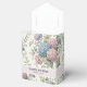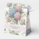 A wedding favor box featuring delicate hydrangea flowers in shades of dusty rose, light purple, and blue.