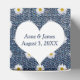 Coração branco com nomes de recém-casados em denim de jeans azul e padrão de margarida.