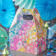 Arte moderna com fundo azul, amarelo e rosa e cobertura de tinta com impressão de plástico branco com bolha de tinta branca.