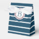Design de temas náuticos com decoração em forma de monograma em forma redonda sobre fundo listrado a azul e a branco