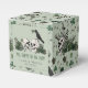 Estas caixas de lembranças de casamento gótico irlandês únicas e elegantes apresentam belas ilustrações temáticas irlandesas desenhadas à mão em tinta preta contra um elegante fundo verde sage. Com trevos verdes, caveiras, corvos, rosas verdes e flores silvestres, esta bolsa de presente verde festiva é ideal para casamentos irlandeses, chás de noiva, festas de solteira e outras celebrações de março ou irlandesas.