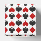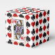 This is a cute gift favor box for a variety of occasions. It features the familiar red, black, and white pattern of diamonds, hearts, spades and clubs commonly found in a deck of playing cards. The front of the box has a gold frame around the winking Queen of Hearts.