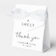 Caixa de favorecimento moderna do seu casamento com "A Sweet Obrigado" em uma simples tipografia e um guião gráfico, seus nomes se juntaram por um coração e sua data de casamento.