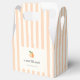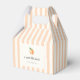 O tema "doce pequeno pêssego" favorece as caixas, com um fundo listrado de pêssego pastel e um roteiro de safra.