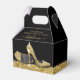 Elegante caixa de favores personalizada com calçados de salto alto com brilho dourado e uma borda brilhante de ouro amarela com bordas de confetti em fundo preto e texto personalizado de "obrigado para comemorar comigo", perfeito para um aniversário moderno e quic, bat mitzvah, Quinceañera, chá de panela, chá de fraldas ou festa de solteira. USE O EDITOR DESIGN para mudar as fontes, cores e o layout para criar uma caixa de favoritos personalizada única e divertida para seus convidados de festas.