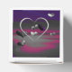 Essa imagem apresenta uma cena surreal, criada digitalmente, com uma coleção de formas cardíacas metálicas flutuando sobre um fundo dramático e multicolorido. Os corações variam de cor - alguns são prata elegante, enquanto outros são preto brilhante ou roxo escuro. Esses corações são reflexivos, dando a eles uma aparência tridimensional, quase líquida-metálica. O fundo apresenta uma abstrato de mistura de roxas profundas, pretos e tons magenta-rosados, criando uma atmosfera moderada e semelhante ao crepúsculo. O efeito gradiente no cenário do céu adiciona profundidade, fazer os corações aparecem como se estivessem suspensos no espaço ou a deriva num vazio sonhador.