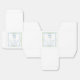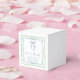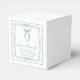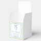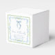 Caixas de lembrancinhas de chá de panela elegantes com molduras de aquarela florais azuis e verde escamoso, um delicado laço coquete azul em aquarela, "amor + agradecimento" apresentado em uma caligrafia azul elegante, e o nome da noiva e a data do chá de panela em tipografia serif clássica.