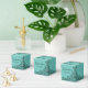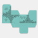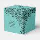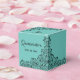 Caixas de 2" x 2" x 2" apresentam um elegante design de linhagem de espirais pretas, flores e folhas sobre fundo turquesa, seu nome no topo, Quinceañera na frente e um obrigado pessoal que você envia no verso. Convites e muito mais na nossa loja.