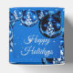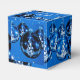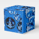 Os ornamentos azuis de cobalto com árvores de Natal estilizadas e prateadas caem contra um céu estrelado para este elegante presente de Natal ou caixa de favores. O texto "Feriados Felizes" pode ser alterado para ajustado do seu evento. As palavras estão em uma fonte prateada quase branca e pálida.