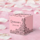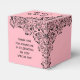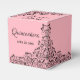 Caixas de 2" x 2" x 2" apresentam um elegante design de linhagem de espirais pretas, flores e folhas num fundo cor-de-rosa, o seu nome no topo, Quinceañera na frente e um obrigado pessoal que você envia no verso. Altere as fontes, as cores da fonte, o texto e até a cor do plano de fundo. Combinando convites e muito mais em nossa loja —> http://bit.ly/2JGREwA <—
