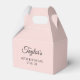 Crie as suas caixas de favores modernas minimalistas de 60 anos. Uma caligrafia elegante clássica emparelhada com uma fonte serif de todos os bonés. Personalize os estilos de fundo cor-de-rosa pálido ou de fonte preta para criar o seu próprio para a celebração especial dela.