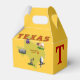 Contorno do Texas com ícones relacionados ao Texas, pássaro, áamo, "bois de longures",flor,ouro feito em fundo dourado