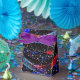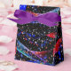 Perfeito para a temporada de festas, esta bolsa de favores marinho-preto apresenta estrelas e luzes multicoloridas brilhantes junto com pistas de cores - vermelho, rosa, rosa, turquesa, azul brilhante. Você tem uma escolha de quatro cores de fita para a fita real no topo da caixa.