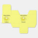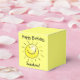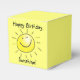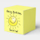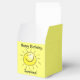 Caixa de favores ao estilo clássico amarelo ao estilo quadrado com uma imagem, na frente e atrás, de um sorridente sol amarelo e o sentimento "Feliz Aniversário, Sol!" Ver cartão correspondente, bolsa de favor, etiqueta de favor e etiqueta. Veja toda a coleção Birthday Favor Box nos TOUCHES ESPECIAIS | Seção Favoritos para festas.