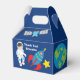 Uma caixa de adversários do teatro legal no espaço exterior para o aniversário de uma criança. Possui um astronauta infantil incrível próximo a um foguete na galáxia. Os lados são decorados com planetas, naves espaciais e o planeta Terra. Personalize com seu obrigado sua mensagem para um pacote de favorecimento de partido galáxico.