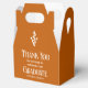 Esta caixa de festa de formatura da escola de medicina veterinária laranja moderna, personalizada, apresenta o nome do formando da faculdade em elegante roteiro branco para a classe de 2024. Personalize com os seus dados sob o veterinário caduceus para ofertas de graduação de excelente.