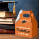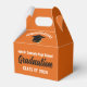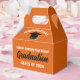 Esta caixa de favorecimento de festa de formatura personalizada moderna, laranja e branca, apresenta o seu nome de segundo grau ou de faculdade para a classe de 2025. Personalize com seu ano de graduação com o script de chic manuscrito e o boné de formando preto para um presente personalizado de manutenção de formando de excelente.