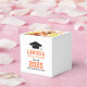 As caixas de festa de formatura modernas apresentam uma foto de mais velho, um boné de formando e um design de tipografia simples que pode ser personalizado com o nome do formando e a escola. As cores de fundo branco e de texto em cor laranja e preto podem ser personalizadas para corresponder às cores do tema da escola ou da festa.